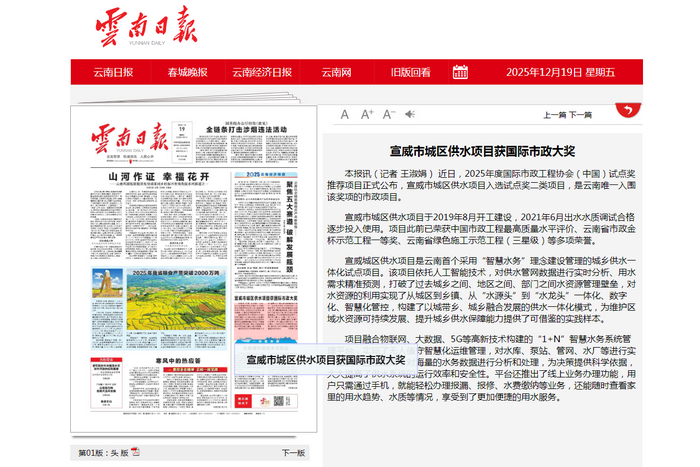 - 《云南日報》頭版:宣威市城區供水項目獲國際市政大獎